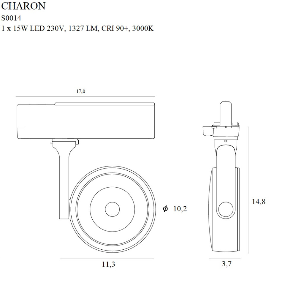 Moc/Power: 1 x 15W LED 230V, 1327 LM, CRI 90+, 3000KW: 11,3 cm, D: 3,7 cm, H: 14,8 cm, Ø: 10,2 cm,Wykończenie/Detail finishing: czarne/blackMateriał/Material: metal, akryl/metal, acrylicKąt świecenia/beam angle: 38° adaptor 3-fazowy/3-phases adaptor Transformator w komplecie/ trafo included